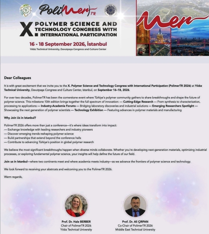 The 10th International Polymer Science and Technology Congress (PolimerTR 2026) will take place at the Davutpaşa Congress and Culture Center, Yıldız Technical University, Istanbul, from September 16-18, 2026.